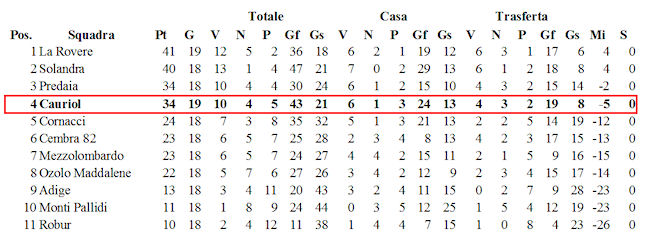 CAURIOL: Pederiva, Vanzetta Alberto, Rizzato (41’ st. Vanzetta Mattia), Bosin, Zini, Sieff, Dellagiacoma, Vanzetta Marco, Silvagni, Partel Erik, Piazzi (22’ st. Zorzi Fulvio). A disposizione: Pochiesa, Zorzi Antonio, Diodà, Zorzi Diego, Bortolotti. La classifica: